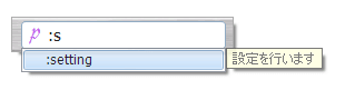 「:s」と入力した段階で、入力補助で「:setting」が表示されるので、
