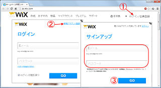 →メールアドレスと希望パスワードを入れて、③「GO」。