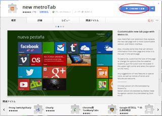 「new metro Tab」拡張機能のページで、右上「+CHROMEに追加」をクリック。