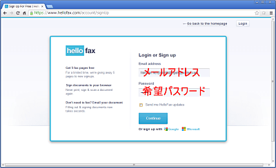 メールアドレスと希望パスワード(6文字以上)を入力、