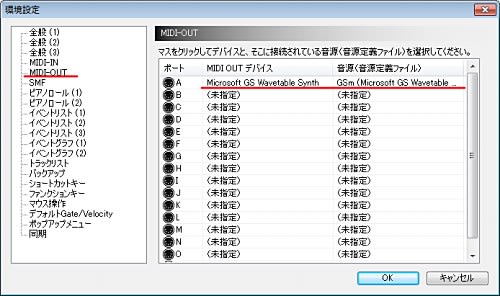 左側で「MIDI-OUT」項目を選び、デバイスと音源をクリックして、選択します。