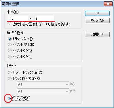 上図の「1:0~2」は、1小節目から2小節目の先頭までなので、1小節目だけ選択されます。
