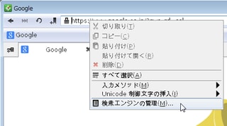 変更するときは、アドレスバー内を右クリック→「検索エンジンの管理」。