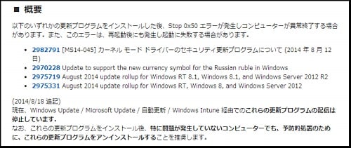 更新プログラムのアンインストール パソコン X Facebook LINE コピー 2014.08.19 マイクロソフトから、 「2014年8月のWindows Updateで不具合が発生する可能性」 について通知がありました。 とくに異常がない場合も、指定された4つの更新プログラムについて、 アンインストールがお勧めされています。 そうは言われても、生徒さんは「???」だと思います。 そこで、更新プログラムのアンインストール手順を、作成しました。 手順書のダウンロードは、こちら。 test ad