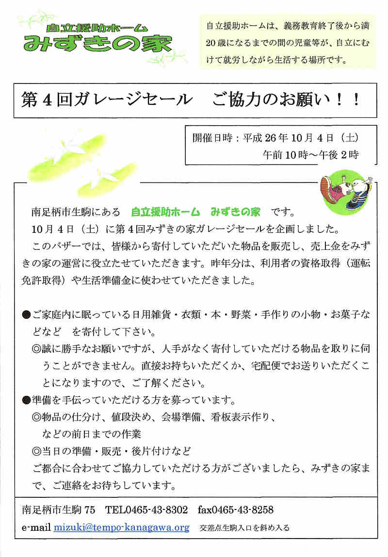 「みずき」の加藤さんから、ガレージセールの案内をもらいました。
