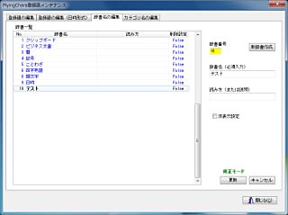 「辞書の編集」タブで、「新辞書作成」で「テスト」という辞書を作成して、「更新」。