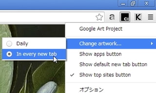 ブラウザ右上のボタンを右クリック→「Change artwork…」で「In every new tab」を選ぶと、