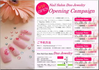 ネイルサロンのチラシ その他 X Facebook LINE コピー 2015.04.07 ネイルサロンのチラシを、作ってみました。 いちばんむずかしかったのは、用語かな。 ネイルアートのことはさっぱりわからないので、 文章作成が一苦労。 テキストは明日。 test ad