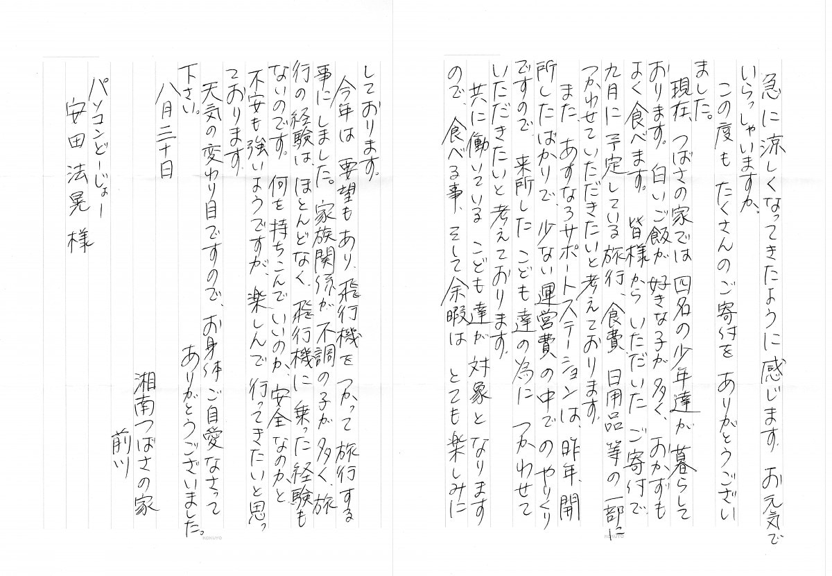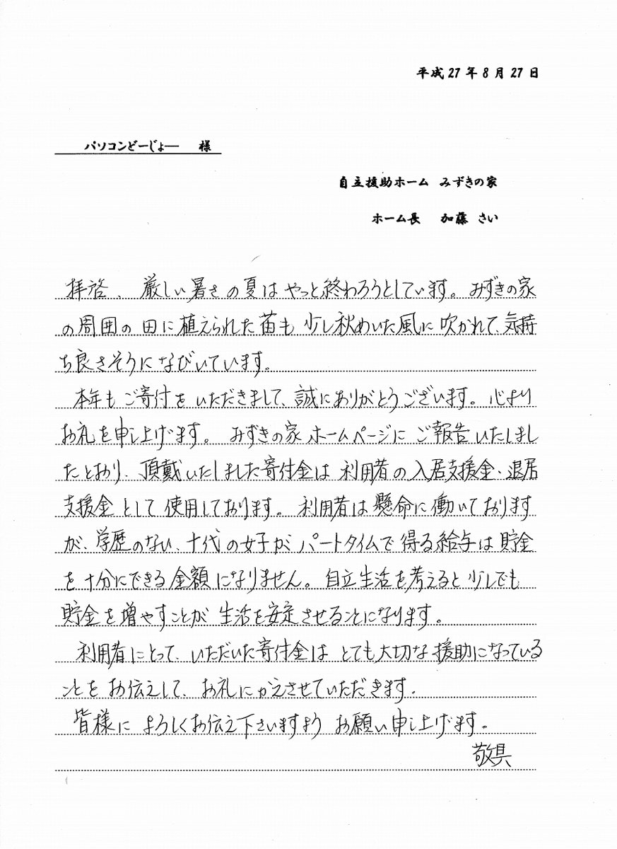 お礼状の報告 その他 X Facebook LINE コピー 2015.09.04 先日の寄付について、お礼状を頂戴しました。 ↓みずきの家 加藤ホーム長さんから(クリックで拡大) ↓湘南つばさの家 前川ホーム長さんから(クリックで拡大) test ad