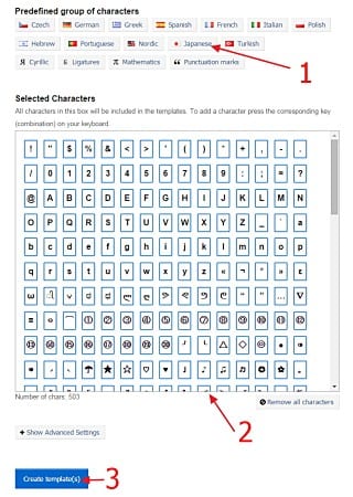 最初は「Select Character Set/Create Templates」タブになっています。