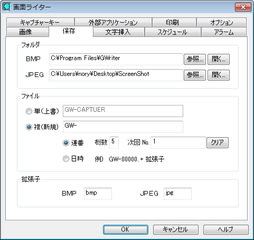 「保存」タブで、保存先フォルダや、ファイル名の付け方を指定。