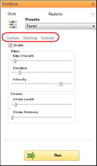 「Contour(輪郭)」「Hatching(陰影)」「Colorize(色付け)」タブで、