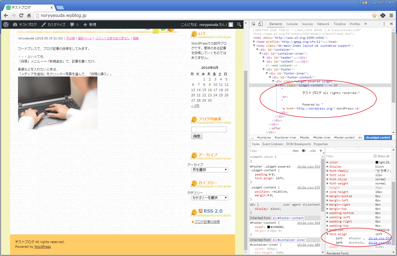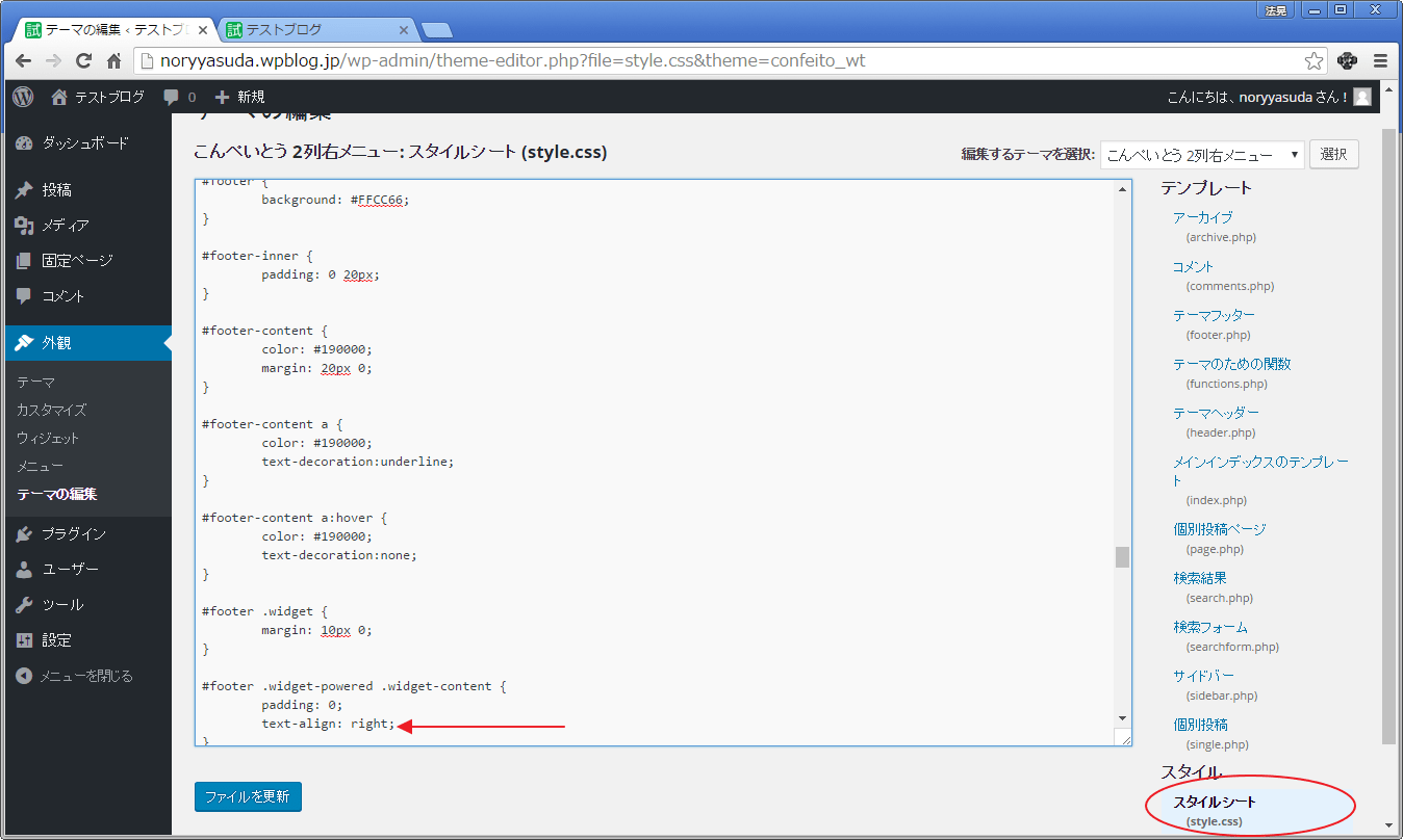footer記述部分の「text align: left;」を、「text align: right;」に書き換え、