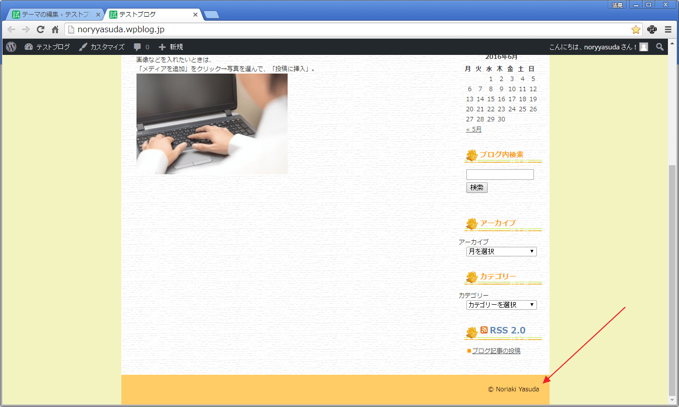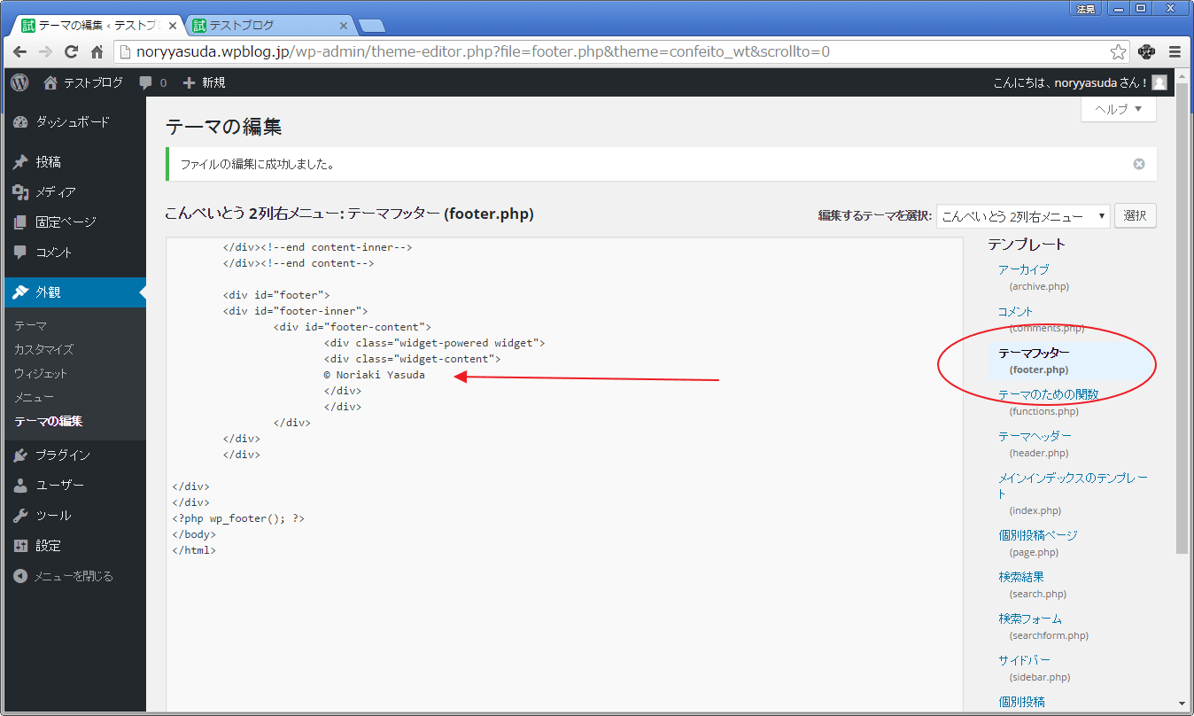 よくある例として、「フッターの内容を変更する」をやってみます。