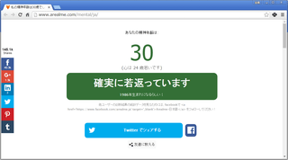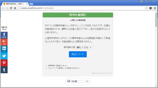いろいろな診断テスト パソコン X Facebook LINE コピー 2016.06.18 いろいろな、診断テスト。 「精神年齢測定」などなど。 質問に答えていくだけ。 手軽に楽しめます。 ほかに、「適職テスト」「住む場所テスト」などなど。 ================================ トップページは英語なので、 たとえば、「精神年齢測定」から別ページに行くといいです。 他の診断テストは、下にスクロールすると出てきます。 精神年齢、30歳でした。 ・・・なんと感想を述べたものか。 test ad