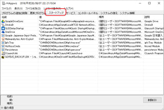 「スタートアップ」タブで、不要なソフトが登録されていないか、チェック。