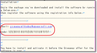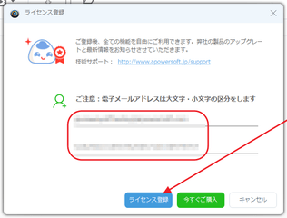 先ほどの「Email」と「Code」をコピペして、「ライセンス登録」。