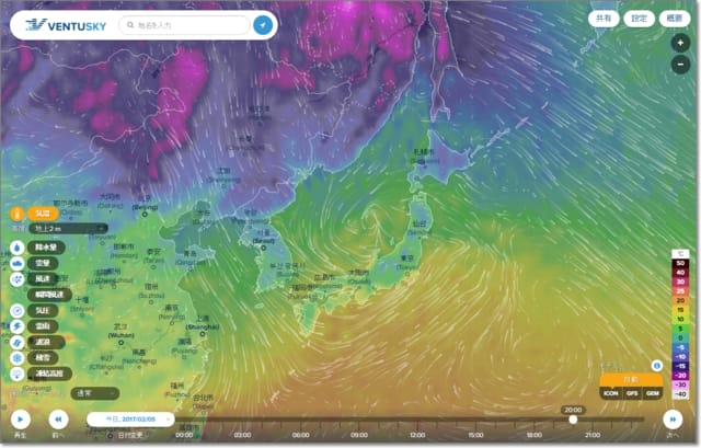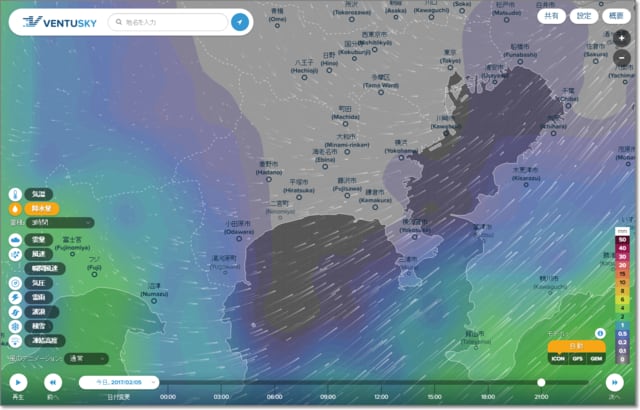 「Ventusky」は、いちばん気になる気温や降水量が、簡単に表示できます。