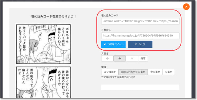 指定したコマは、「埋め込みコード」または「URL」で貼り付け。