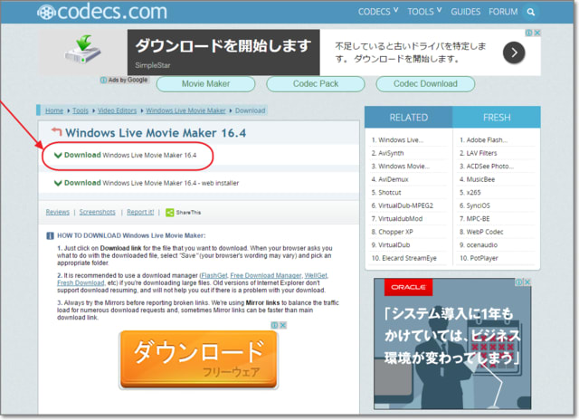 Codecs.comのページを開いて、「Download」リンクをクリックして、ファイルを入手。