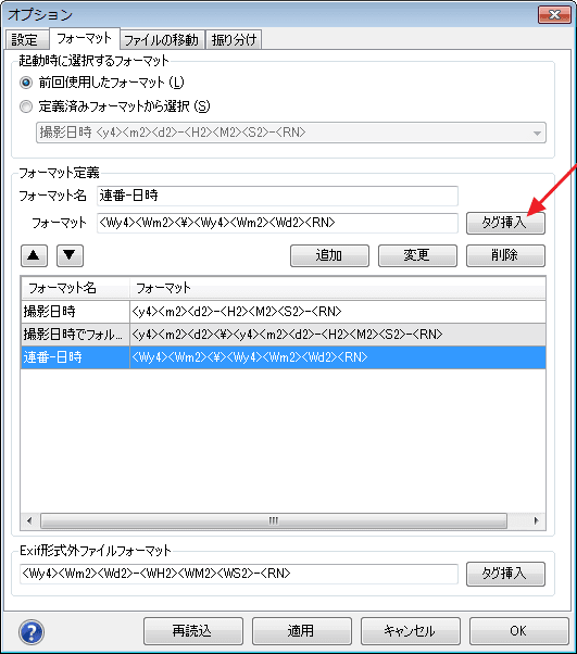 フォーマットの書式は、1「設定」→「タグ挿入」を見ると、だいたいわかります。