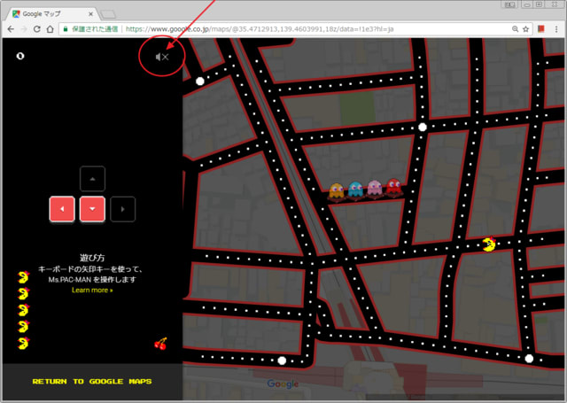 Google地図でミセス・パックマン パソコン X Facebook LINE コピー 2017.04.01 今年も、Google地図でパックマンができます。 今年は、ミセス・パックマン。 エイプリルフール恒例だから、すぐに終わっちゃうと思います。 好きな地域の地図を表示して、左下「コインを入れる」をクリック。 音もOKなら、スピーカーマークをクリック。 カーソルキーを押すと、スタートです。 test ad