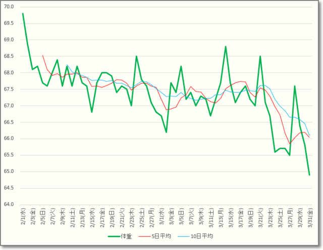 体重変化の移動平均 教材(Excel) X Facebook LINE コピー 2017.04.02 ダイエット中の体重変化を、グラフにしてみます。 ただ、体重はちょっとした要因で変化します。 それだけ見ていると、ダイエットが順調に推移しているのかどうかがわかりません。 移動平均線を使って、「傾向」を確認してみましょう。 テキストのダウンロードは、こちら。 test ad
