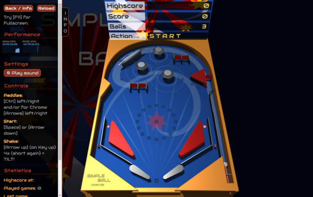 「←」「→」キーがフリッパー、スペースキーがボール打ち出し。