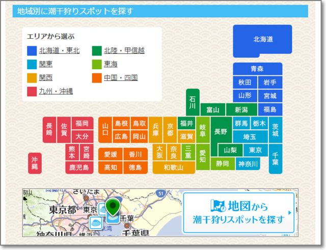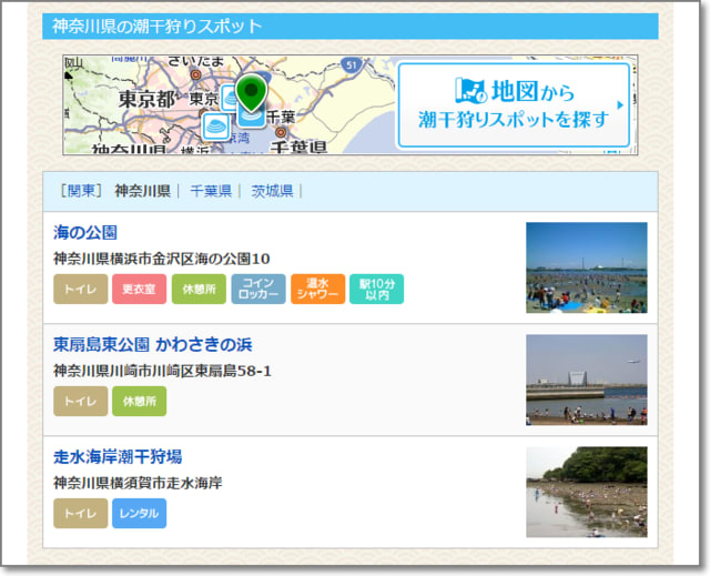 地図情報も合わせて、潮干狩り場所の情報が整理されています。