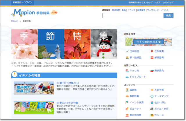 マピオン季節特集」で、昨日から「潮干狩り特集」が始まりました。