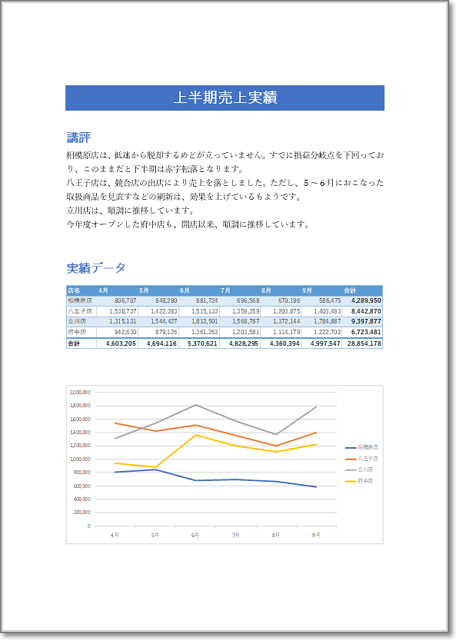 エクセルで作成した表やグラフを、ワード文書中に貼り付けてみます。