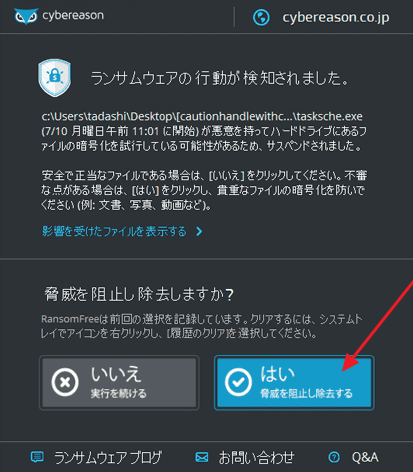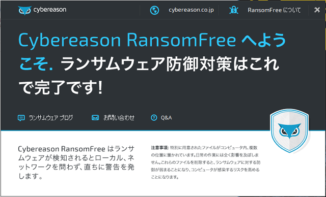 万一、ランサムウェアが検知されると、↓が表示されるそうなので、