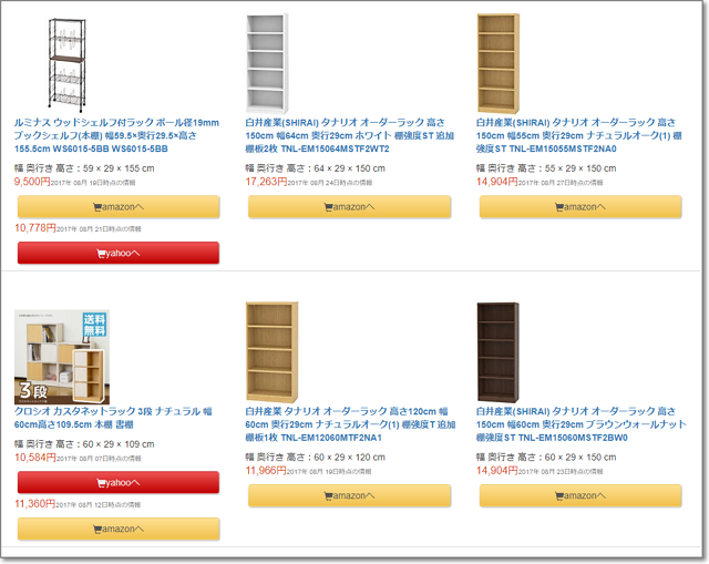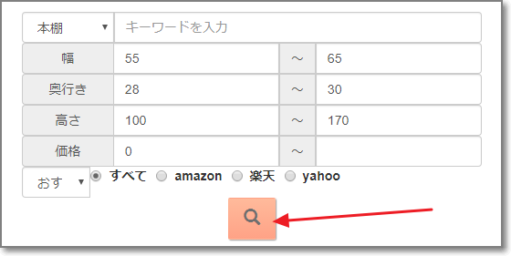ためしに、「幅55~65cm、奥行き28~30cm、高さ100~170cmの本棚」を、