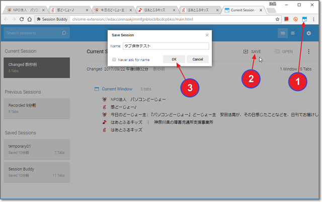 1.保存したい表示状態のときに、「Session Buddy」アイコンをクリック。