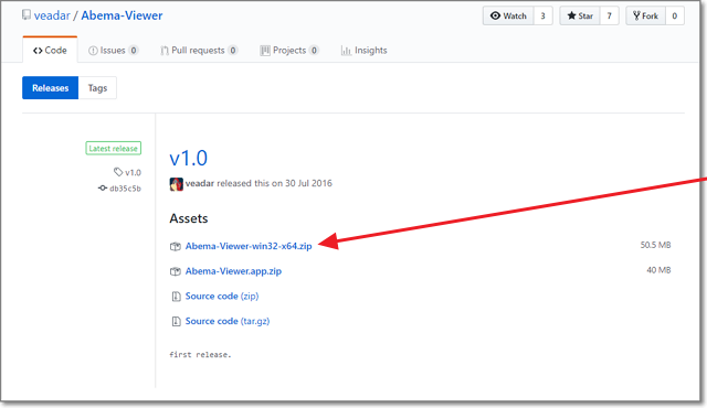 ダウンロードページから「Abema-Viewer-win32-x64.zip」ファイルを入手