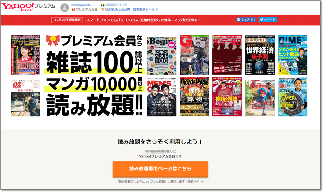 Yahoo!プレミアムの案内ページから、「読み放題専用ページはこちら」をクリック。