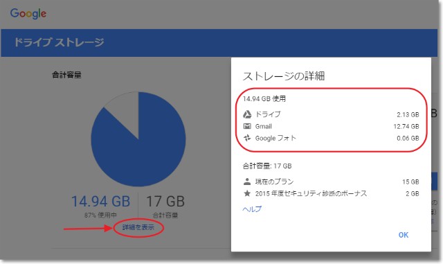 「詳細を表示」をクリックすると、サービス別の使用容量が出ます。