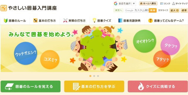 「囲碁のルールを覚える」→「基本の打ち方を学ぶ」→「クイズに挑戦する」で、