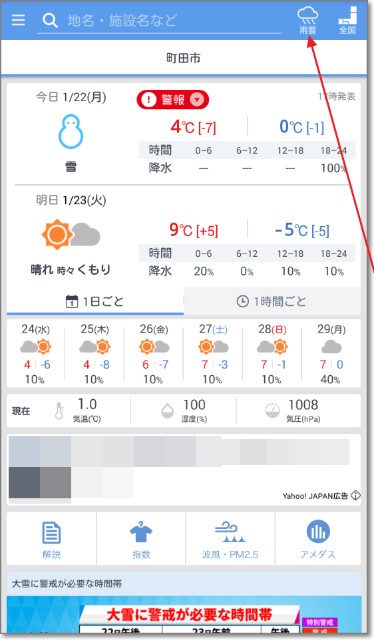 上部「雨雲」アイコンをクリックして、「雨雲ズームレーダー」を開きます。