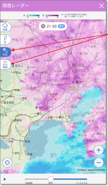 左側「雨雪」をタップすると、「雨雪レーダー」に。