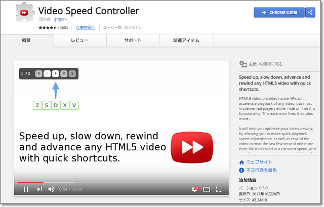 ストリーミング動画の再生速度などを、キーボードで調整できるChrome拡張機能。