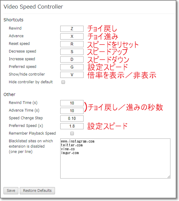「Video Speed Controller」を入れると、Youtube以外も含めて、