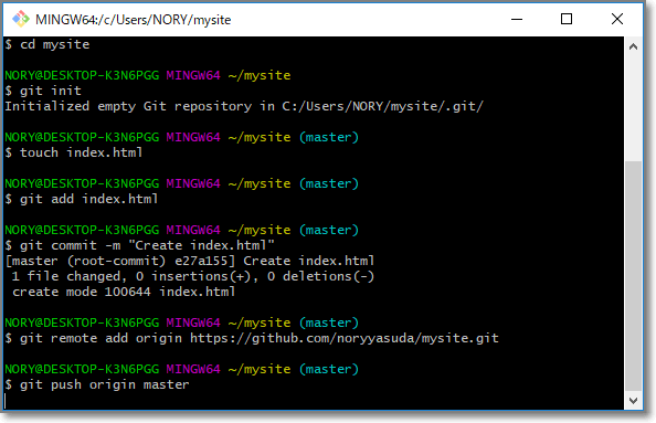 Git Bashに戻って、言われるまま、index.htmlをPushします。