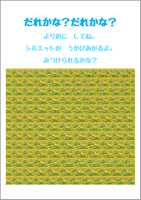 シルエット画像のステレオグラム(2) その他 X Facebook LINE コピー 2018.03.12 「だれかな?だれかな?」の、ステレオグラム編サンプルを作りました。 ↓クリックすると、電子書籍が開きます。 (透かしが入ってしまっています。) テクスチャ(背景画像)にイラストを使うと、うまくいきません。 ただでさえむずかしいのに、心眼でないと見つけられないくらい。 ゴチャっとした写真や、ランダム画像が向いているようです。 test ad