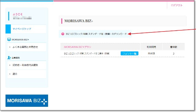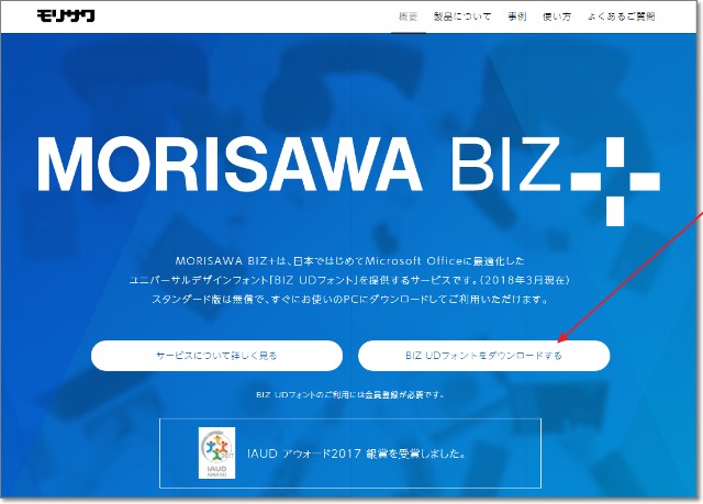 「モリサワBIZ+」のページを開いて、「BIZ UDフォントをダウンロードする」。