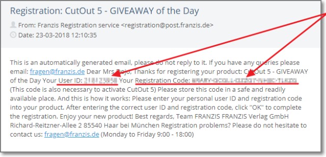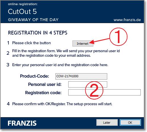 「User ID」と「Resistration Code」に書かれている文字を、②にコピペ。