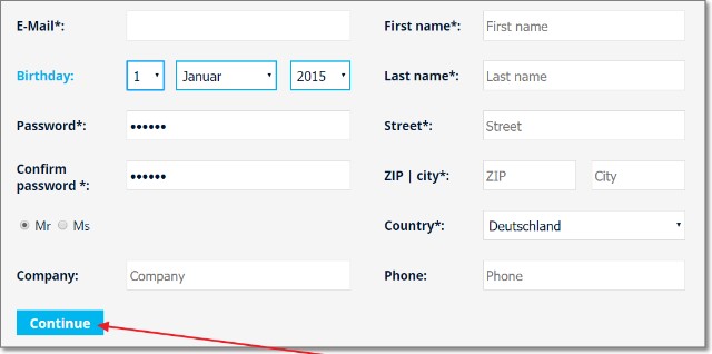 必要事項を入力(「*」のついている項目は必須)して、「Continue」。
