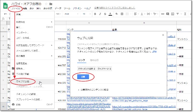 「ファイル」メニュー→「ウェブに公開」→「公開」。