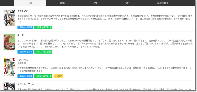 読んでみたいときは、そのマンガ項目のどこかをクリック。
