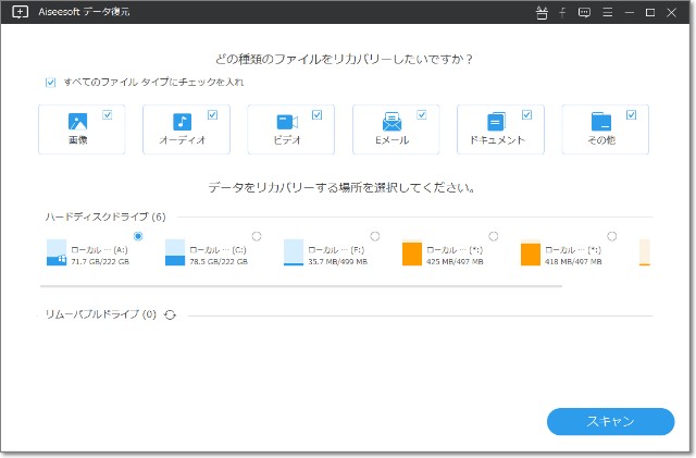 最初に、探したいファイル形式と、探したい場所(ドライブ)を選択し、